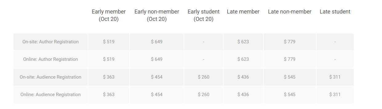 - All meals during the conference (coffee breaks, lunches);